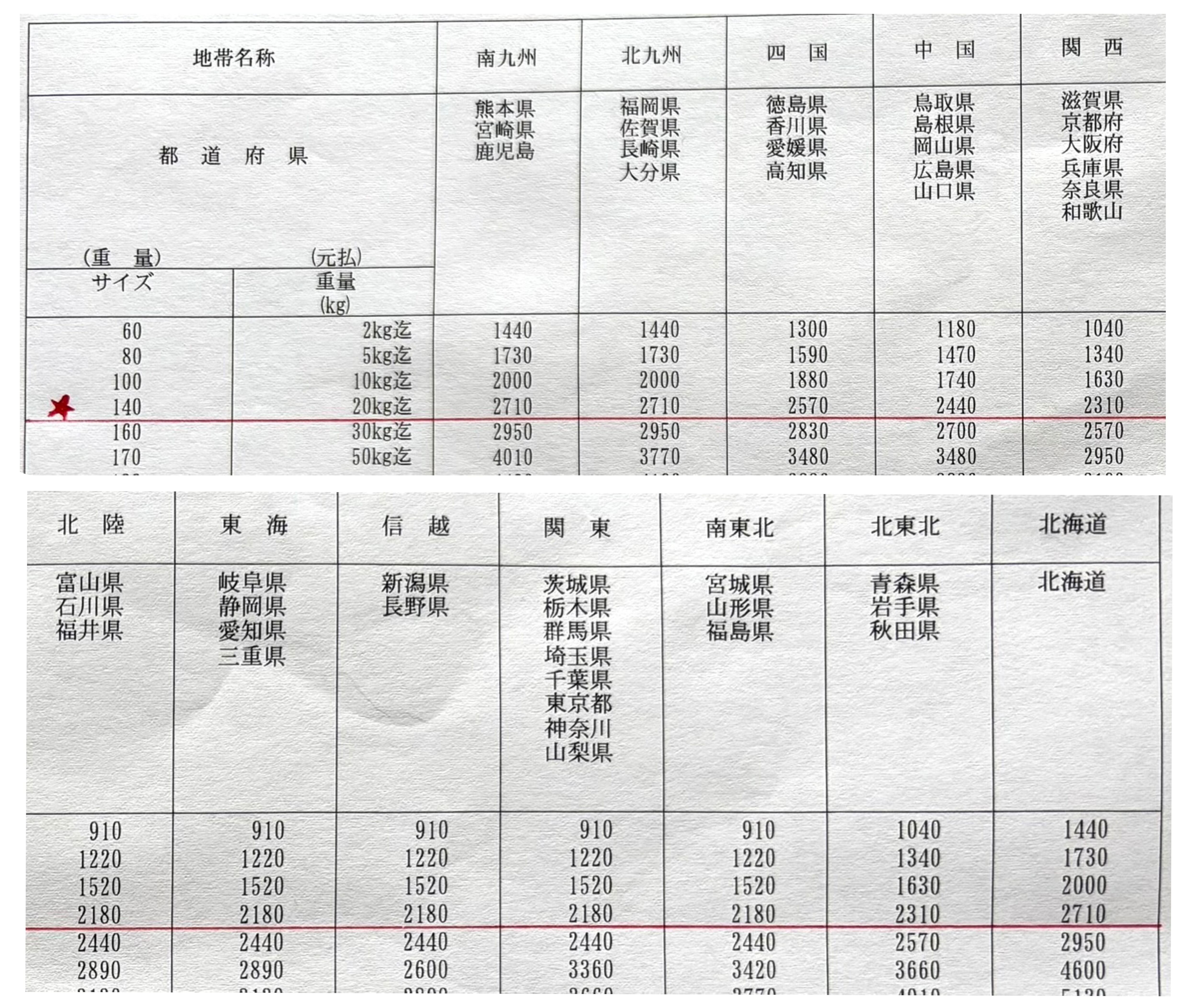 地域後ごとに料金が異なりますので、画像を参照ください。